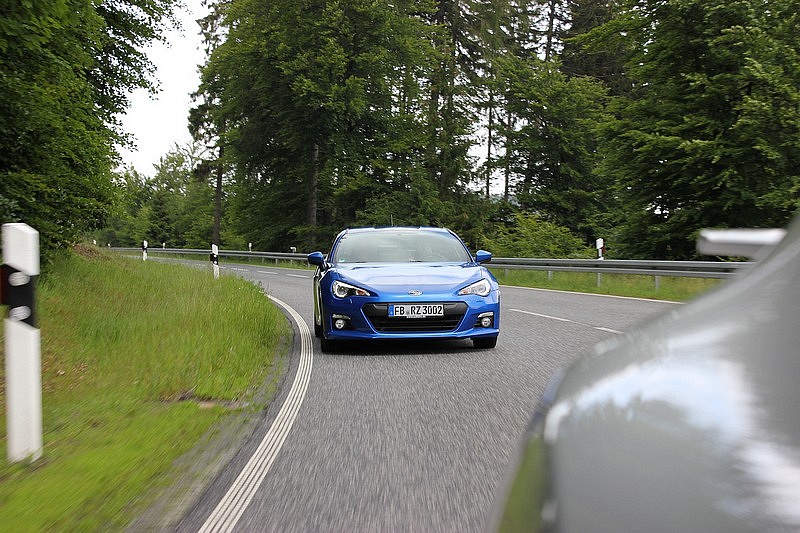 Allradgrip-verwöhnte Tester in einer Heckschleuder... gefährlich? Keineswegs. Der BRZ ist unglaublich gut und neutral abgestimmt und bietet mit abschaltbarer Traktionskontrolle und abschaltbarem Stabilitätsprogramm alle Spielmöglichkeiten. Sind alle Systeme stillgelegt, so lässt sich der Hecktriebler problemlos in Leistungsübersteuern versetzen. Der kurze Wagen und das geringe Fahrzeuggewicht erfordern dann zwar schnelleres Gegenlenken als bei größeren Modellen, aber das Fahrzeug tut im Grenzbereich genau das, was man erwartet. Nicht mehr und nicht weniger. Mit jedem Kilometer in SUBARUs neuem Spaßmobil verbreitert sich unser Grinsen. Die Pneus in der Dimension 215/45 R17 bieten in Verbindung mit dem straff, aber nicht unkomfortabel abgestimmten Fahrwerk eine Lösung, die keine Wünsche nach größeren Rädern offen lässt. Die Seitenneigung fällt dabei – sicher auch aufgrund des sehr niedrigen Schwerpunktes – extrem gering aus.