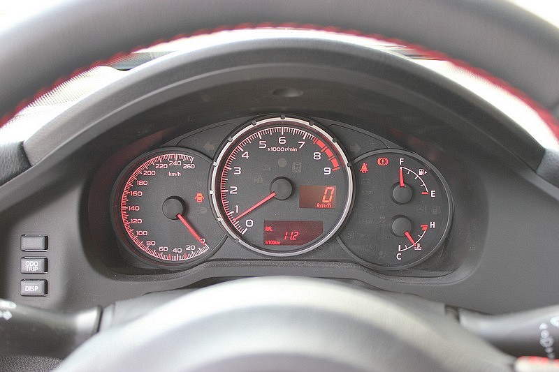 Auf dem Weg dorthin haben wir Zeit, uns mit dem Interieur auseinanderzusetzen. Alles in allem hat SUBARU wie auch bereits beim Impreza ab 2008 einen konkurrenzfähigen Innenraum geschaffen, der sich sehen lassen kann. Einzig Details wie die anachronistische Digitaluhr oder die auf Stelzen montierte und den Blick nach hinten einschränkende dritte Bremsleuchte passen nicht recht ins Bild. Die Sitze bieten guten Seitenhalt und sehen wie auch die hinteren Sitzmulden mit Alcantara- und Leder-Bezug und rot abgesetzten Nähten sehr gut aus. Das Lenkrad sieht nicht nur sehr gut aus, es fühlt sich auch so an und ließ sich bei allen Fahrern in die optimale Position einstellen.