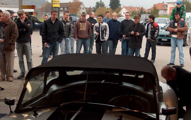 Frau Mittelstädt vom "Koch-Team" verwöhnte uns großzügig mit Speis und Trank. Es fehlte uns an nichts, ein spezielles Dankeschön dafür! Als Überraschung für uns Autofreaks, organisierte Helmut Koch einen AC Cobra 427, der plötzlich mit ohrenbetäubendem Bollern in die Prüfhalle fuhr. Mit einem Standgeräusch von 108 db, stellte es einem da schon die Nackenhaare auf. Geschweige denn während des Laufes… Das war ein unglaubliches Erlebnis.