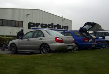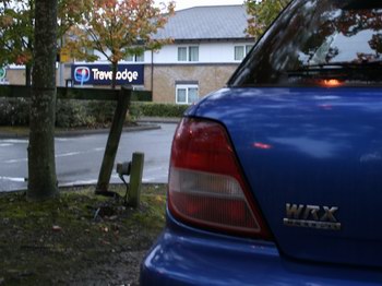 Blaue Autos scheinen im Tunnel besonders gefährlich zu sein und so mussten Jens und ich mal eben über 30 EUR mehr bezahlen als der silberne Impreza von Frank. Vielleicht war es aber auch einfach der Spoilerzuschlag... Auf der anderen Seite des Kanals ging es direkt wieder auf die Autobahn wo der erste einheimische Impreza nicht lange auf sich warten lies. Dieser begrüßte unsere Reisegruppe aus Deutschland standesgemäß mit einem kleinen Feuerwerk (siehe Video). Nach einer recht unterhaltsamen Fahrt erreichten wir um 11 Uhr unsere Travelodge unweit der kleinen Ortschaft Bicester. Bis unsere Zimmer frei waren vertrödelten wir die Zeit im Restaurant um die Ecke und holten anschließend erstmal eine Mütze Schlaf nach, sofern das die Hüpfbetten zuließen. Gegen 16 Uhr machten wir uns dann auf den Weg in Richtung Banbury, wo die Empfangsdame des Prodrive-Teams bereits auf uns wartete.