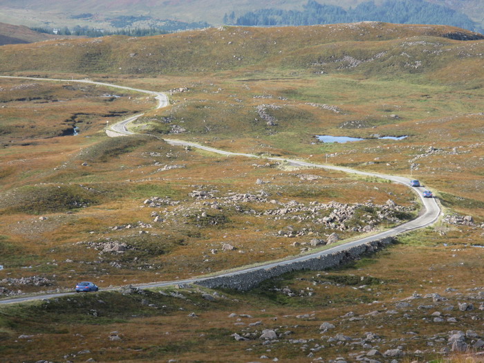 Jetzt war es Zeit für einen der Höhepunkte der Tour, die steilste Bergstraße Großbritanniens, den „Pass of the Cattle“ Richtung Applecross. Gut, die Leute mit alpinen Erfahrungen werden über diesen Pass lächeln, aber wir hatten oben auf dem Pass ein wenig Schnee und sahen sogar ein paar Graupelschauer (was mit Sommerreifen doch einige Schweißtropfen erzeugt). Oben auf dem Pass angekommen zeigte uns eine Ureinwohnerin, warum Single Track Roads doch etwas kniffelig sind und nur erfahrenen Fahrzeugführern empfohlen werden können: Für das Rückwärtsfahren von circa 20 m brauchte sie echte 5 min. Wahrscheinlich hatte sie den Führerschein im britischen Lotto gewonnen.