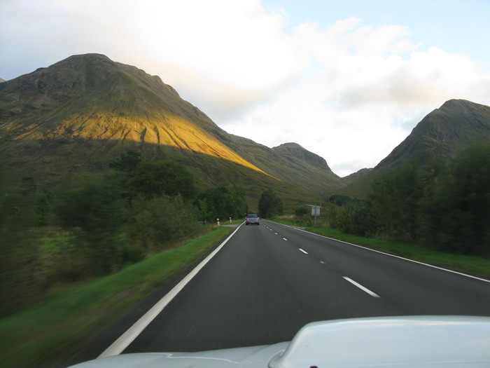 Da am nächsten Tag die Abfahrt von Newcastle schon gebucht war, mussten wir möglichst weit südlich gelangen. So brachen wir schnell wieder auf und fuhren über Fort William und Glen Coe. In Glen Coe und Rannoch Moor wurde die karge Landschaft durch den Sonnenuntergang noch verstärkt. Kapitale Hirsche standen am Straßenrand, und spätestens hier war jedem klar, dass eine Wiederholung notwendig ist. Einige nutzten die letzten Lichtstrahlen, um Glen Orchy noch zu durchfahren, eine einzigartige Single Track Road mit vielen Hügeln und Senken. Am Ende erreichten wir Stirling im Dunkeln und konnten Stirling Castle in voller Beleuchtung betrachten.